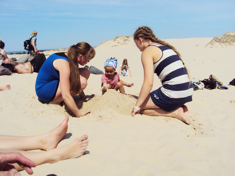 Oben auf den Wanderdünen genossen wir den sanften Wind und den Blick in die “Wüste”. In den verschiedenen Altersklassen fanden Wettrennen statt: Runter die Düne – abklatschen – hoch die Düne. Alle Teilnehmer haben sich tapfer geschlagen und ihr Bestes gegeben. Am Ostseestrand angekommen, freuten wir uns am kühlen Wasser und waren erstaunt wie ruhig diesmal die See war. Bei der acht kilometer langen Wanderung zurück zu den PKW´s war viel Zeit für Gespräche. Ausgehungert konnten wir uns beim Fischmann den Bauch mit frischen Ostseefisch füllen und noch einen Stadtbummel unternehmen. Nach über 25 Stunden Ausflugszeit sind wir alle wohlbehütet und erschöpft am Zeltplatz angekommen und in unseren Schlafsäcken verschwunden. Dies war ein Tag des Lobpreises Gottes für uns.